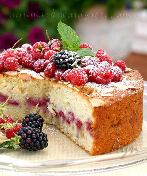 Для этого кекса подойдут любые сезонные ягоды или мягкие фрукты, и в зависимости от вида используемых ягод или фруктов  можно варьировать вкусовые добавки. Добавить корицу с яблоками, миндальный экстракт с абрикосами и сливами, или добавить цедру апельсина,  как я делала, с ежевикой.