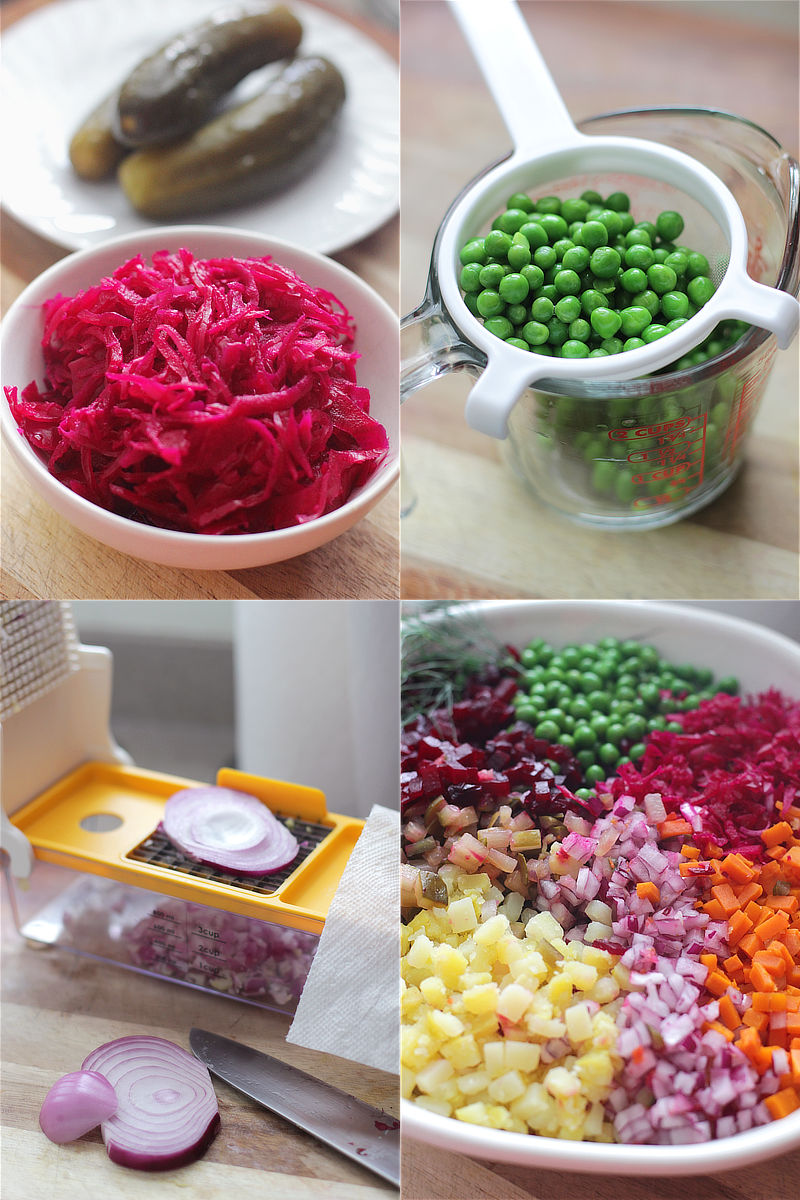 - Все овощи нарезать на мелкие кубики (по возможности меньше 1 см, удобно использовать Vegetable Chopper). Лук мелко порубить. Капусту отжать и мелко порубить (рассол добавить в винегрет).